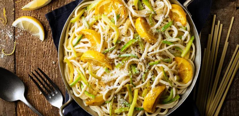 Les linguine ressemblent à des spaghettis plats. Ils sont en fait légèrement plus larges. Le mot "linguine" vient du terme italien "lingua", qui signifie "langue", en référence à leur forme plate et allongée qui évoque une langue. Les pâtes sont ici associées à du citron et des courgettes. L’ensemble est lié par une crème au parmesan. Miam !