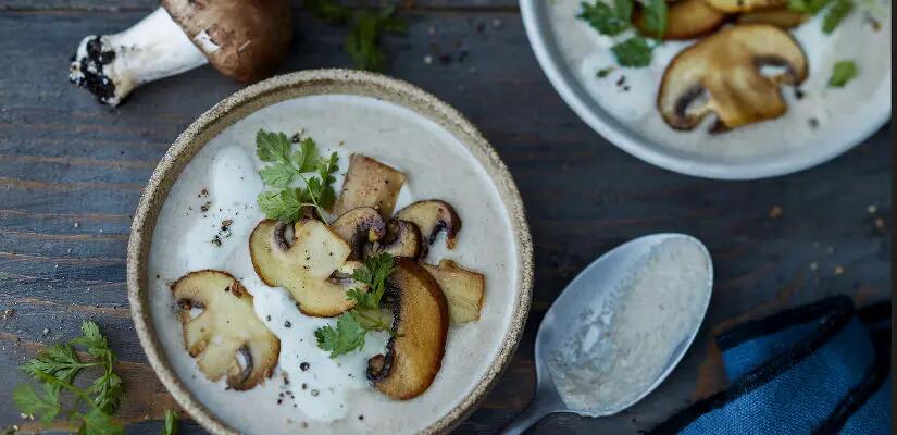 Les champignons de Paris (ou autres champignons des bois) se savourent avec bonheur lorsqu'ils sont cuisinés avec une touche de Crème de Saint Agur. Une idée recette à servir dans des bols, avec quelques champignons poêlés et brins de cerfeuil (ou persil).