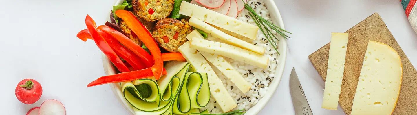 Découvrez une recette qui respire la fraîcheur et le bien-être : une salade composée, sans viande, rehaussée par le fromage basque Etorki UHAITZA. Un plat qui réunit une grande variété de légumes, des radis roses, du poivron rouge, des courgettes crues, des jeunes pousses, le tout enrobé d'une vinaigrette légère à l'huile d'olive et citron.