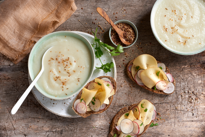 Une savoureuse recette de dahl aux lentilles corail et blond, dés de courge butternut, pousses d'épinard et curry, garni des "roses" de fines tranches de Fol Epi. Un repas complet et équilibré ! Une recette nutri-score A.