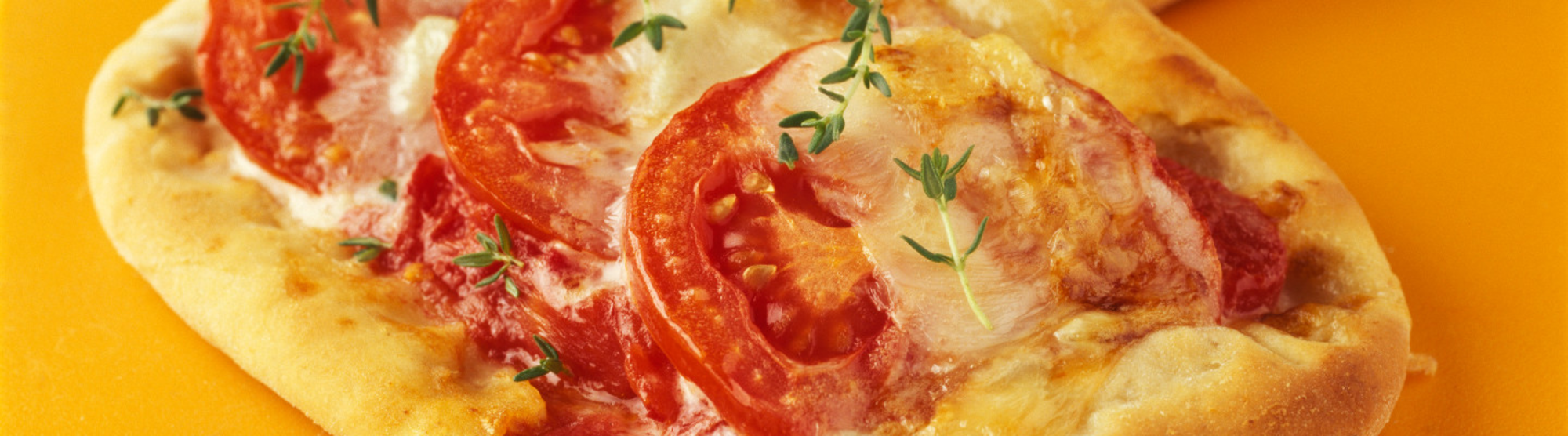 - 8Couper la tomate en rondelles et la disposer sur la pizza.