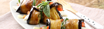 - 3Préparer les roulés: disposer sur une lamelle d'aubergine un morceau de fromage, une crevette, quelques dés de poivron et de la roquette puis rouler. Fixer le roulé avec un pic ou une tige d'oignon nouveau, et décorer avec quelques feuilles de basilic.