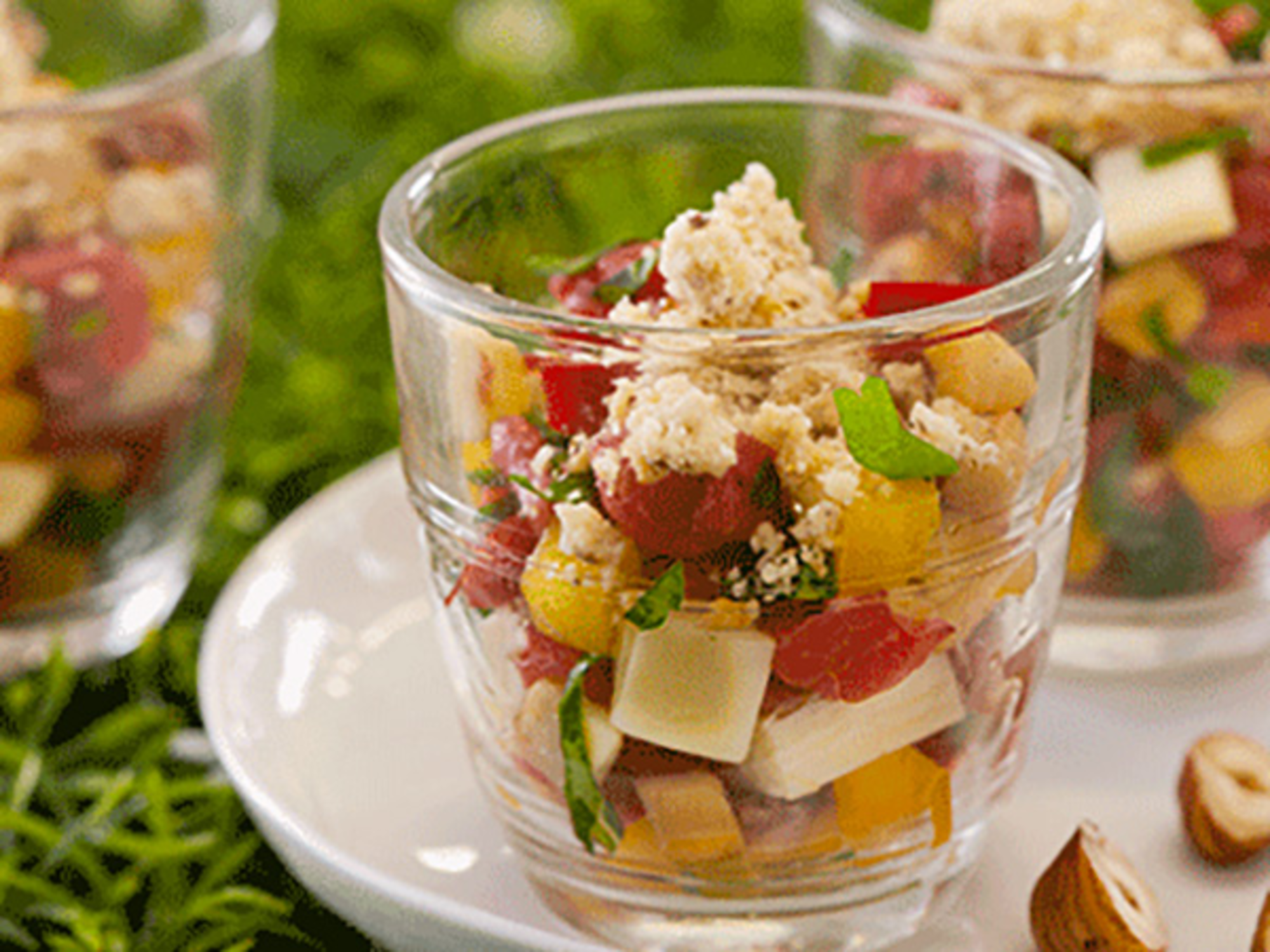 Des dés de bœuf cru mélangés à des morceaux de Fol Epi®, de tomates, poivrons, de champignons de paris et de persil ciselé, surmontés d’un crumble aux noisettes.
